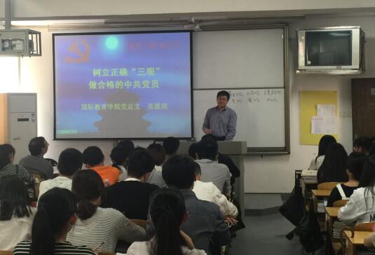 国际教育学院院长张漾滨作了题为《树立正确“三观”做合格的中共党员》的辅导党课。他概括了十八大以来,以习近平同志为核心的党中央提出“一个中国梦、两个统筹、三严三实、四个全面、五大发展理念”等新常态下治党、治国、治军的举措和描绘的中华民族伟大复兴的宏伟蓝图,提出要认真贯彻“四进”(进支部、进社团、进网络、进党团课),坚定“四信”(对共产主义的信仰,对中国特色社会主义的信念,对中国共产党的信任,对以习近平同志为核心的党中央的信赖),自觉践行“三严三实”,走群众路线,争做一名中国共产党的合格党员。