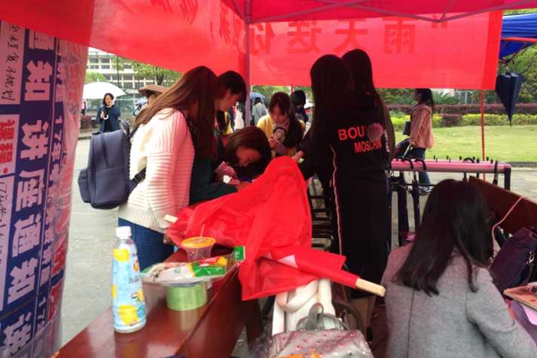 长沙的天气多变,不论什么季节,常会突然间下起雨,一大群同学在教学楼大厅内不知所措,思虑后的选择也只有两个:要么冒雨前行,要么等待同学送伞。“给忘记带伞的同学提供伞,让雨天也变得美丽。”会长周恋芹自豪地说道。