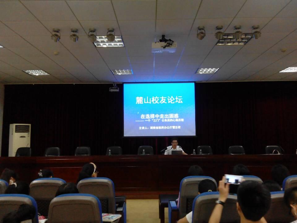 6月16日下午,旅游管理学院主办的“麓山校友、企业家讲坛”在二办301开讲,本次讲座由我校校友、现在湖南省政府办公厅工作的雷志君先生主讲。