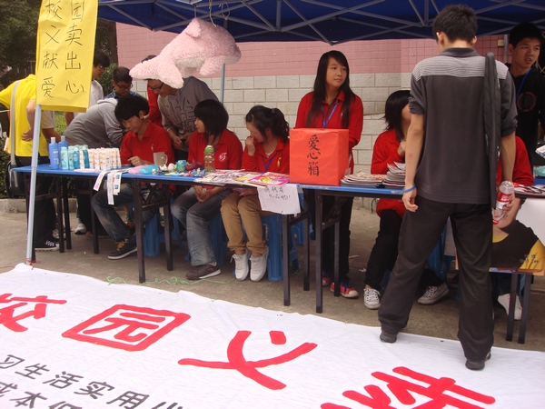 10月12日,由我校旅游管理学院分团委主办,旅游管理学院青年志愿者协会承办,设计艺术学院、工商管理学院、经济与贸易学院、外国语学院青年志愿者协会协办的主题为&“九九重阳节,浓浓敬老情&”系列活动之&“校园义卖&”活动圆满结束。本次义卖活动总收益约1200元,主办方将以现金和实物的形式捐赠给敬老院。
