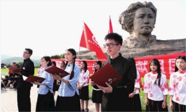5月3日,学生在毛主席塑像下朗诵《沁园春·长沙》。当天,湖南商学院团委组织100余名青年教师和大学生身穿“五四”学生装,在橘子洲头青年毛泽东塑像旁,通过朗诵、书法、合唱爱国歌曲等形式,庆祝第97个青年节的到来。