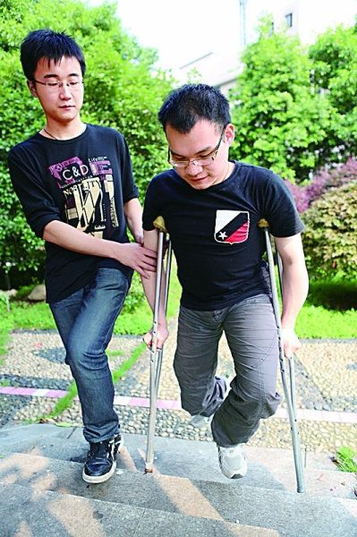 遇上实验课,要爬楼梯,就是寝室总动员,两个人架着腋下,一个人托着臀部,还有两个负责拿拐杖,把其他人的书包驮在身上。