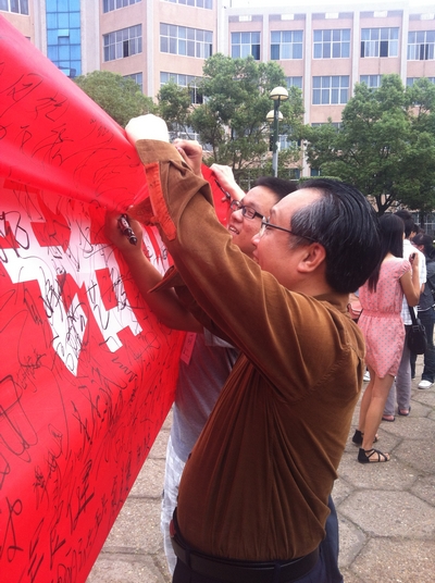 湖南商学院党委书记欧阳与青年学生一道在横幅上签名