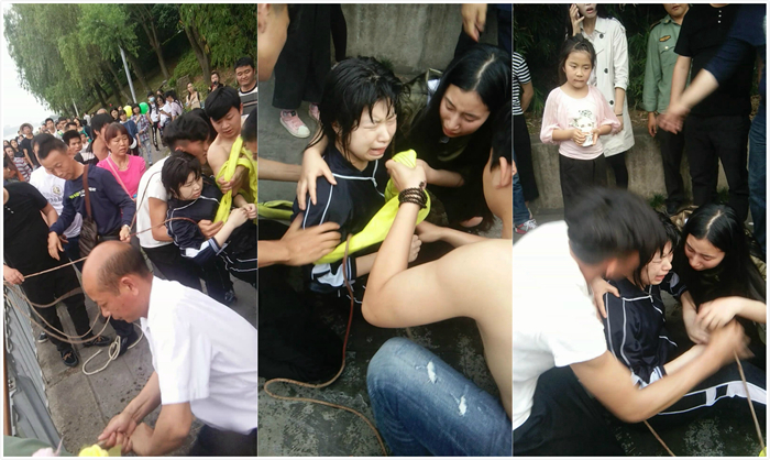与此同时,有人拨打了120,有人通知景区保安,有人呼喊江中的游艇过来营救。时间一分一秒地过去,女孩渐渐体力不支,由垂直向上的状态变为水平躺在江面上,生命意识逐渐微弱。终于,外围的支援很快就到了,景区工作人员递过来一根专业的救援绳,徐守宝打好结,抛下去,父亲很利索地套在女儿腰上,“一、二、三…一、二、三”,众人使劲,在小女孩的身体离护栏还有半米左右时,徐守宝毫不犹豫地探出腰,伸出手,一口气把她抱了上来。