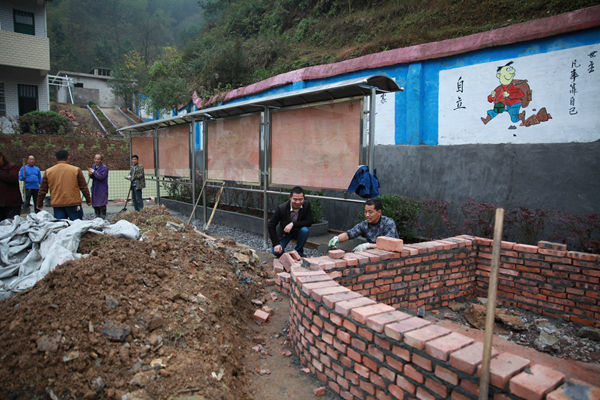 8:30,孩子们正式上课后,工作队来到小学操场,查看“新邵最美村小学”创建的基建工程进展,图为周军军与修建主席台的施工人员交谈。