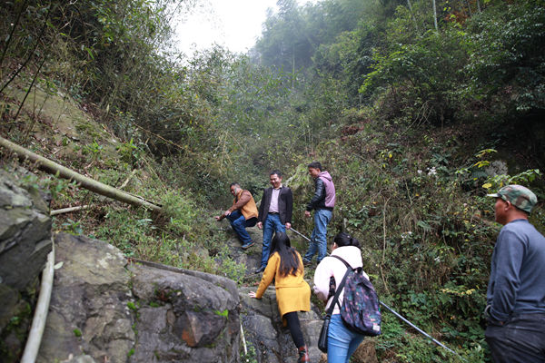 16:00,在和5组、9组村民代表讨论了修蓄水池的筹劳筹资基本方案后,工作队和村民代表一同赶赴取水点现场勘察,山路陡峭湿滑,要手脚并用才不至于滑倒。