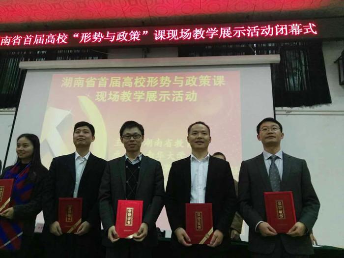 10月29日,湖南省首届高校“形势与政策”课教学展示活动决赛在南华大学举行。我校马克思主义学院副院长聂智副教授夺得本科组第一名,荣获一等奖,并将作为湖南省本科院校唯一推荐代表参加教育部组织的全国网上微课展示和现场授课展示。