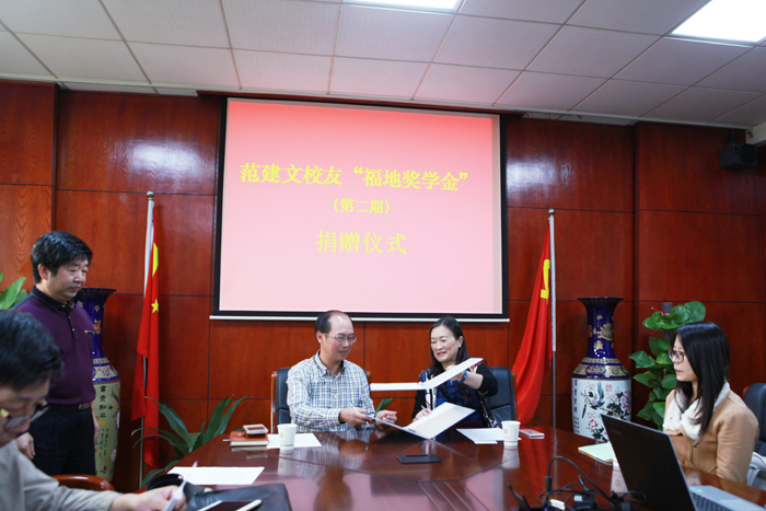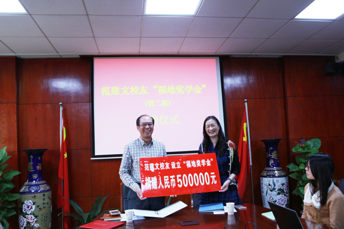 范建文校友一直以来对母校充满深厚感情,关心母校建设发展,关爱母校学子,在2009年11月母校60周年校庆期间,曾捐赠20万元,率先设立校友奖学金“福地奖学金”,至2014年发放完毕,已累计资助贫困优秀学生120余名。 今年又主动提出再捐赠50万元,继续设立第二期“福地奖学金”,用于资助母校更多贫困优秀学生顺利完成学业。(文/校友办 摄影/陈璐明)