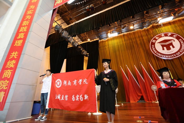 仪式上,在校生代表从毕业生手中接过了绣有湖商精神的旗帜。全体毕业生向母校庄严宣誓,“铭记校训,常怀感恩,爱国守法诚信为本,恪敬职守勇于担当,求真务实努力创新,报效祖国服务人民,为实现伟大的中国梦而努力奋斗!”