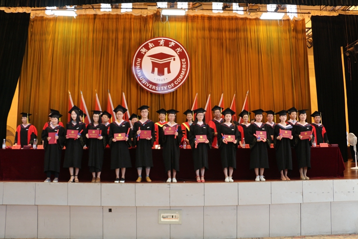 在庄严的国歌中,毕业典礼正式开始。副校长刘国权宣读《湖南商学院关于准予吴辉君等同学毕业的决定》、《湖南商学院关于授予吴辉君等同学学士学位的决定》。校党委副书记夏继春宣读了省级优秀毕业生和自主创业优秀毕业生的表彰通报。仪式上,获得省级优秀毕业生荣誉称号的代表上台接受了荣誉证书。