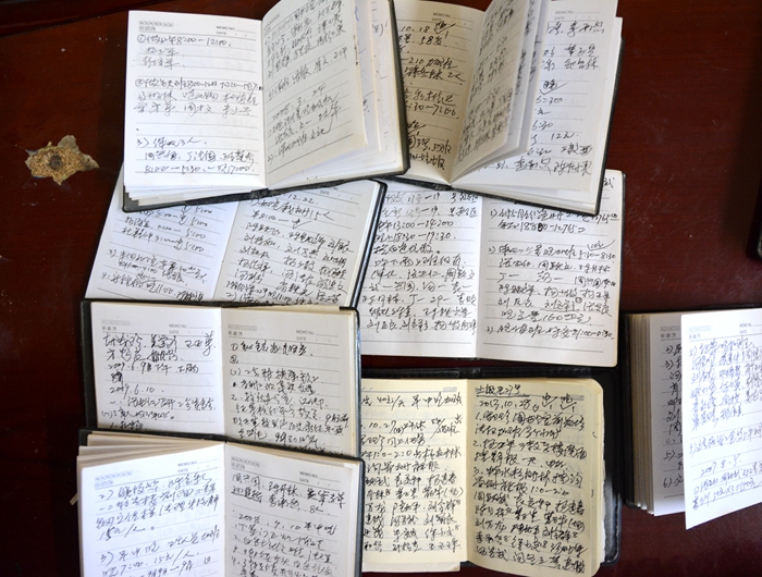 一个笔记本,一只手电筒,一辆自行车,这是老张常备的“后勤三宝”。“谁加了班、熬了夜我都要记录下来,人家干了活可不能亏待人家。他们的工作很辛苦,酷暑寒冬都没得休息。平时能照顾的地方都要尽力照顾。”翻开老张的近二十个笔记本,随处可见他记录的工友信息,哪怕是偶遇的临时工提出的小困难他都一一记下。他对工友的管理既严格又友善。