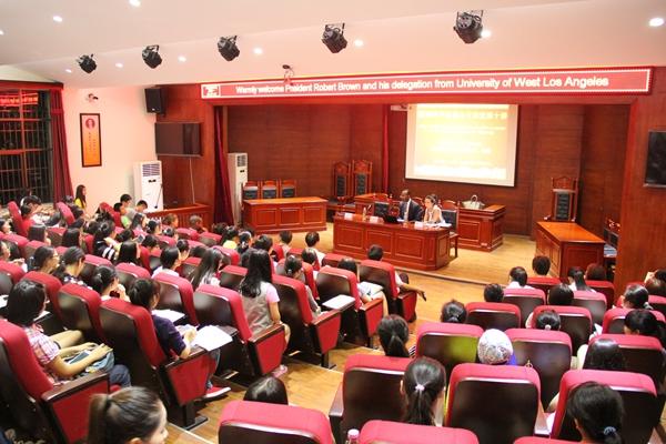Brown校长首先向在座师生介绍了西洛杉矶大学的概况,他结合自身经历,与在座师生分享了自己选择法律为业的原因和意义。他说,投身法律事业是一个优秀青年奉献社会、帮助他人的有效途径,可以使我们在帮助他人的过程中,得到精神享受和自我提升,选择法律专业,是综合考虑人的机遇、刻苦、努力、自信和坚持等因素后,作出的正确人生选择。