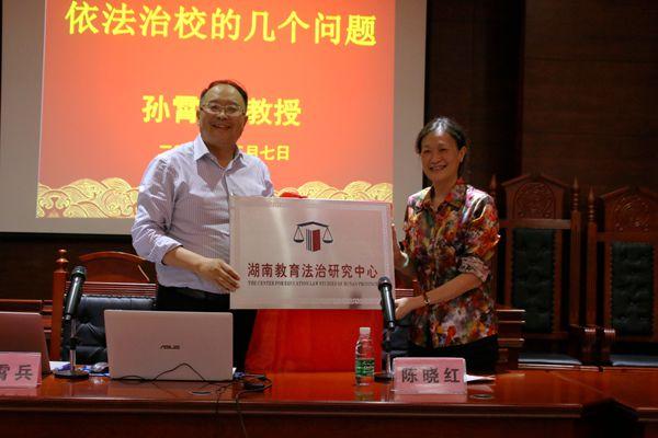陈晓红校长发表致辞,代表学校对孙霄兵司长来我校讲学表示欢迎,并简要介绍了孙霄兵司长在教育政策与法制方面的理论研究和实践探索成果,希望孙霄兵司长的讲座能为我校推进高等教育治理体系和治理能力现代化提供启发和建议。讲座开始前,孙霄兵司长和陈晓红校长还共同为落户我校的“湖南教育法治研究中心”揭牌。