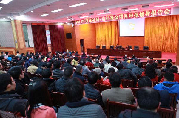 1月13日下午, 2015年国家社科、自科基金申报辅导报告会在图书馆多功能报告厅举行,报告会由校长陈晓红教授、柳思维教授主讲。副校长王明高教授主持会议。