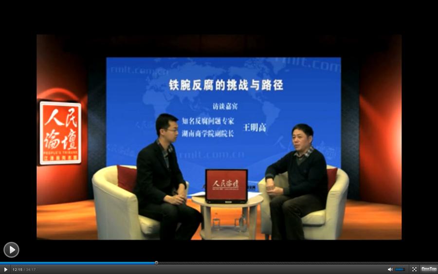 十八大以来,党中央以刮骨疗毒的勇气,重典治乱,扶正祛邪,坚持“老虎”、“苍蝇”一起打,反腐败斗争在这一年多来出现了新的气象,社会各界评价很高,期待更高。近期,我校副校长王明高教授做客人民论坛网视频演播室,接受该网“政论大讲堂”栏目的专访,和网友们共同探讨“铁腕反腐的挑战与路径”热点话题。