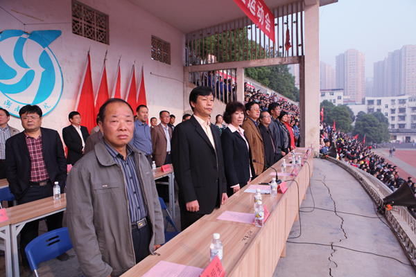 升旗仪式结束后,校长唐未兵致开幕词。他代表学校对本次运动会的开幕表示热烈祝贺,向筹备本次比赛的师生员工表示衷心的感谢并致以亲切问候和良好祝愿。唐校长总结并肯定了一年来我校师生体育方面取得的优异成绩,并指出校运会是推动我校体育发展的重要活动,也是对我校师生运动水平、精神文明建设的大检阅。希望以此为契机,树立广大师生‘终生锻炼’的健康理念,培养顽强拼搏的精神意志,以良好的精神风貌投入到工作、学习、生活中去。最后,唐校长预祝本次运动会取得圆满成功,选手们赛出优异成绩。