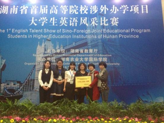 此次比赛分为命题演讲和情景交流两部分,美国、英国驻华使馆官员和&“211高校&”英语教育专家担任评委。湖南农业大学、中南林业科技大学等八支队伍参加了此次比赛。我校选手在刘彬老师、陈咏涛老师、曹杨老师的精心指导组织下,以优异的表现征服了评委和观众,尤其在情景交流部分,流利自如的对答博得了现场观众一次次喝彩。我校学子流利的英语表达、良好的专业素养充分展现了我校中外合作办学项目学生的实力与风采,反映了我校一贯以来的团队合作、务实求上精神,强烈的集体荣誉感和较强的中外合作办学能力。
