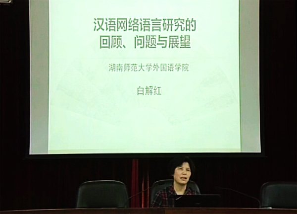 讲座中,白解红教授从中国互联网人数位居世界第一这一事实引出网络用语研究的可行性与重要性,并从启蒙阶段、初步发展阶段、深度发展阶段对汉语网络语言研究的历史进行回顾。白教授对汉语网络语言研究中存在的对网络语言的认知、规范、态度等问题进行了阐述,并探讨了网络语言与语文教学、当代社会文化、网民的心理特征以及网络词汇生成的认知机制等问题。